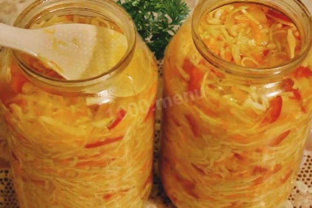 - капусту шинкуем тонко, выкладываем в кастрюлю, наливаем оставшееся растительное масло, выкладываем овощную заправку, насыпаем сахар и соль, варим овощи примерно 5 минут;