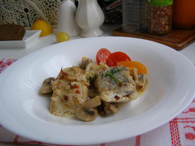 Готовый лук и грибы вынем. А теперь сначала на дно мультиварки отправим ломтики щуки, а потом усыплем их луком с грибами.