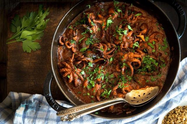 Добавляем томатный соус и порошок чили. Накрываем крышкой и продолжаем тепловую обработку на умеренном огне. Понадобится еще сорок минут, в конце солим. После того как кальмары будут готовы, выкладываем их на тарелку и посыпаем петрушкой. Отличным решением будет подать кальмаров с пастой.