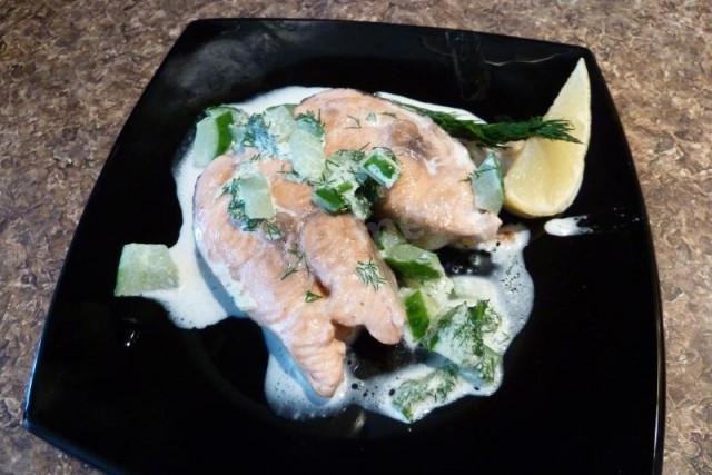 Соус подчеркивает нежный вкус семги, блюдо питательные и полезное! Семга как раз та рыба, которую многие из нас не привыкли жарить, как например тот же минтай. Её используют для бутербродов, нарезок, но реже традиционно. Семга очень жирная рыба, а значит и сытная. В ней содержится огромное количество питательных элементов и витаминов. Такую рыбу нужно есть хотя бы раз в неделю для того чтобы восполнять потерянные от стрессов микроэлементы. И для того чтобы разнообразить ваше рыбное меню, я хочу предложить вам кулинарный рецепт, в котором семга жарится в огуречно-укропном соусе.