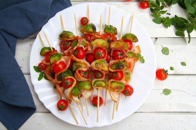 На шпажку попеременно насаживайте капусту и помидоры, оборачивая их беконом, как показано на фото. У томатов черри стопки лучше удалить, если они есть. Так будет удобнее дегустировать блюдо. Я же оставила несколько штук для красоты.