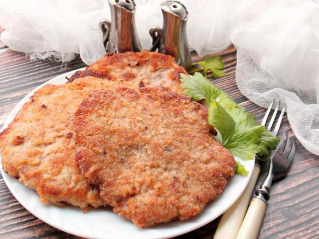 Переворачиваем и обжариваем вторую сторону еще 3-4 минуты, до готовности шницеля. Так же поступаем со всеми сделанными шницелями. А чтобы они каждый раз получались аппетитного вида, после каждого шницеля, протираем сковороду от обгоревших сухарей и остатков масла.