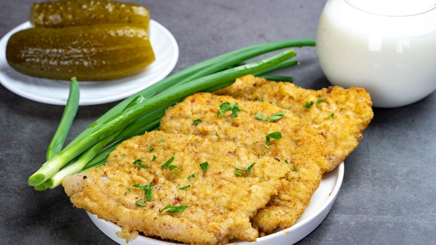 Выкладывайте довольно быстро обжаренный во фритюре шницель в панировке на порционную тарелку и подавайте к столу на обед или ужин.