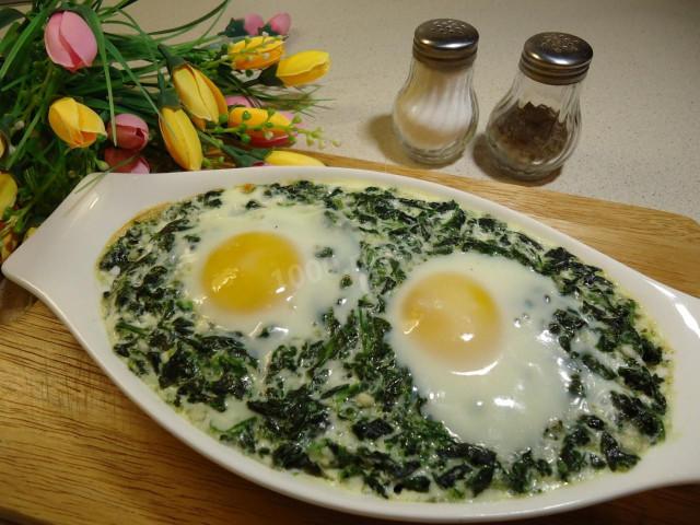 Форму смазать растопленным сливочным маслом. Уложить шпинатную массу, сделать два углубления и в них разбить яйцо, сверху яйцо чуть подсолить. Осторожно налить оставшееся молоко, чуть прокалывая шпинат вилкой, стараясь не повредить желток. Поставить в разогретую до 180 градусов духовку приблизительно на 18 - 20 минут. Не передержите ! Яйца должны схватиться /как в глазунье/. Подавать надо сразу - подогревать нежелательно. Приятного аппетита !