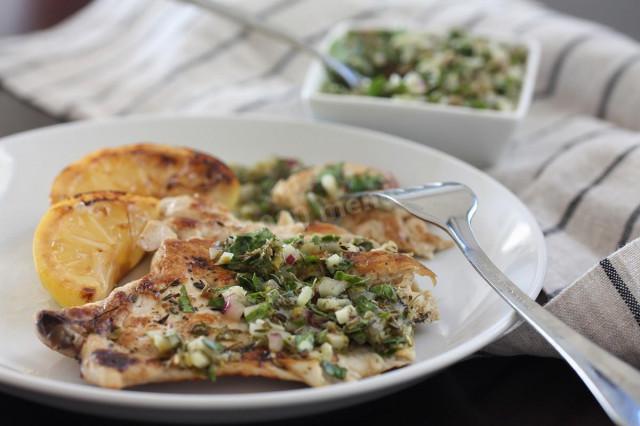 Выкладываем готовые отбивные на порционные тарелки, подаем с Сальса Верде.