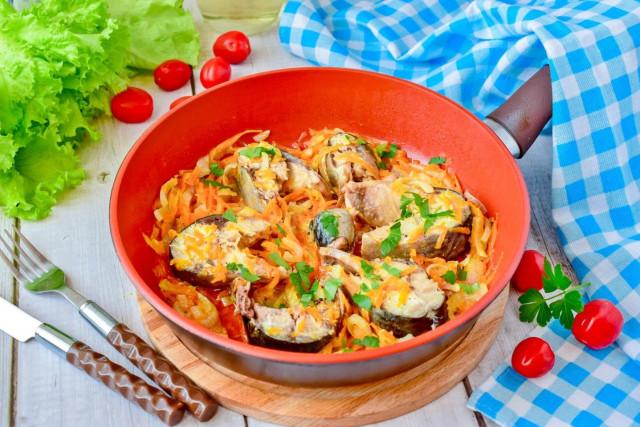 Затем выложите в сковороду подготовленные кусочки скумбрии. Лук и морковь равномерно распределите между кусочками и разложите немного по ним.
