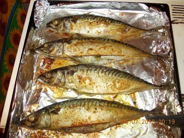 Рыбу помыть, выпотрошить и хорошенько обсушить бумажными полотенцами. Бульонный кубик (куриный) раскрошить. Выпотрошенную и обсушенную скумбрию с обеих сторон натереть кубиком. На противень уложить фольгу, смазать маслом,положить рыбку. В духовку на 20-25 мин при температуре 180-200 градусов. Можно употреблять в горячем и холодном виде. Приятного аппетита!!