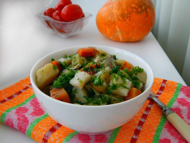 С тыквы снимаем кожуру, вынимаем из нее мякоть, семечки и нарезаем ее кубиками. Бобы, горох, стручковую фасоль можно взять, если есть, замороженные. Свежий болгарский перец нарезаем соломкой либо также используем заморозку.