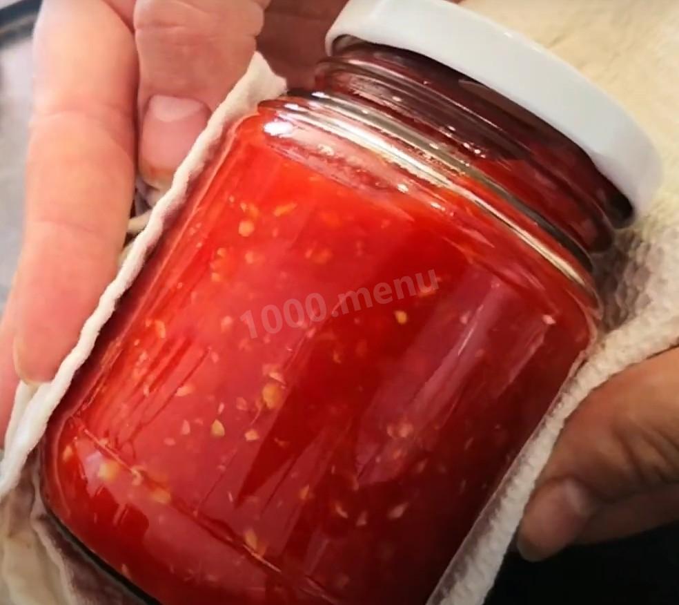 Еще горячий соус разливаем в стерильные баночки закатываем и укутываем, и оставляем до полного остывания.