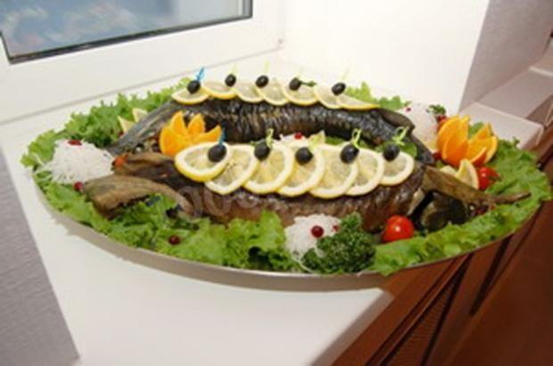Рыбу выложим на блюдо, украсив ее по желанию. Готовую стерлядь можно подать с овощами - свежими огурцами или помидорами, а также с разной зеленью.