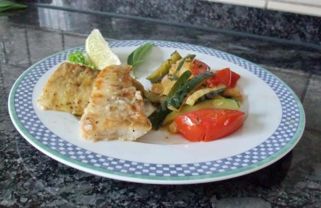 Рыбу выложить красиво на тарелке, рядом положить овощное рагу, украсить свежей зеленью, полить оливковым маслом.