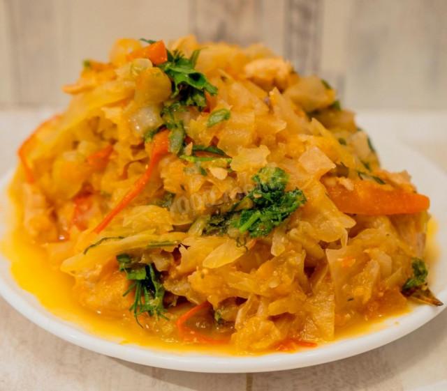 Раскладываем приготовленную тушеную с мясом индейки и овощами капусту по тарелкам и подаем к столу.