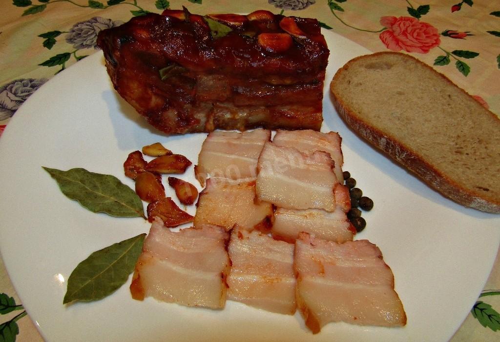 Посыпать грудинку нарезанным пластинами чесноком и поломанным лавровым листом, отправить в духовку запекаться на 40 минут при 180 градусах без конвекции. Достать грудинку из духовки. Смазать ее оставшимся маринадом и отправить еще на 20-25 минут запекаться. Подавать грудинку можно как горячей, так и холодной — вкусно одинаково.