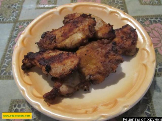 Затем в соус обмакнем кусочки мяса. Поставим их в холодильник. А через время поджарим их. Можно обвалять их в муке или панировочных сухарях – это будет как кляр. А можно и сам кляр отдельно приготовить – из одного яйца, соли и муки.