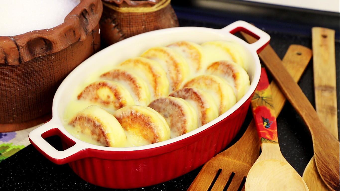 быстро, просто, безумно вкусно, и немножко калорийно:). Нежные, пышные сырнички в ароматной сметанно-сливочной подливкой. Они напоминают мое детство и детский садик. Это так вкусно, что невозможно оторваться.