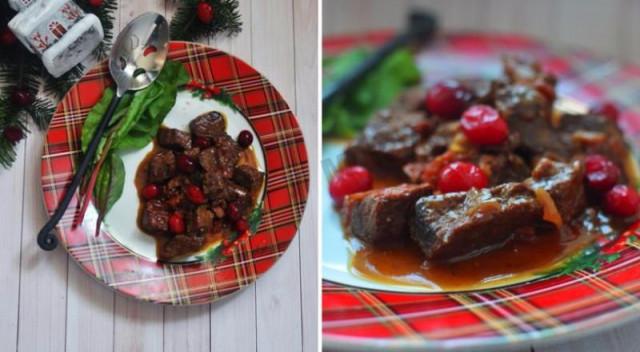 Телятина тушенная в пиве с клюквой и вялеными помидорами
