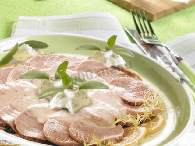 7. Телятину нарезать тонкими ломтиками, полить соусом, украсить зеленью и оставшимися каперсами. Телятина вителло тонато готова! Приятного аппетита!