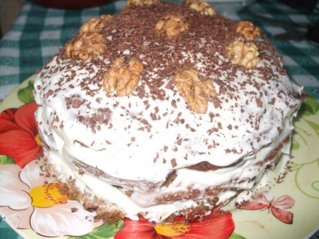 Вкусный тортик со сметанным соусом и грецкими орехами! Если быть точной, данный кулинарный рецепт называется «Торт Пень трухлявый». Лучше всего он получается из варенья, сваренного из черной смородины, хотя некоторые хозяйки иногда готовят такой тортик и из другого варенья.