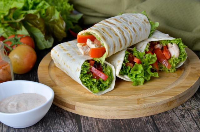Куриное мясо, овощи и зелень, завернутые в лепешку! Приготовить дома это традиционное мексиканское блюдо совсем не сложно. И времени на это уйдет не много. Тортилью можно подать как основное блюдо, а можно взять с собой как вкусный и полезный перекус.