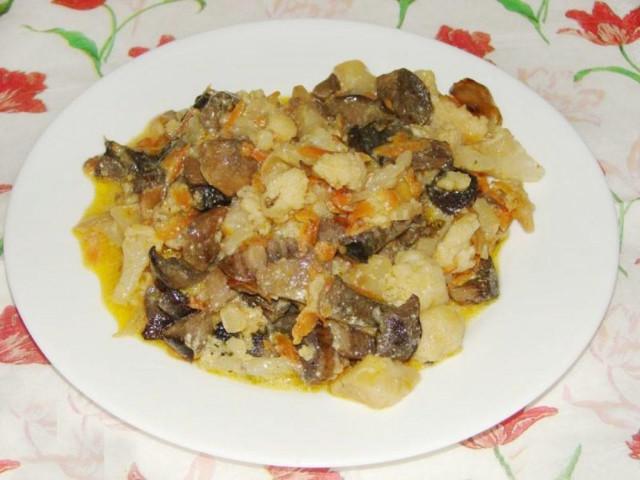 После этого добавляем на сковороду к грибам и овощам цветную капусту. Тушим грибы с цветной капустой до готовности около двадцати минут. В конце солим, перчим по вкусу. Кладем сметану и сливочное масло. Тушим еще минут пять. В конце кладем порубленную зелень.