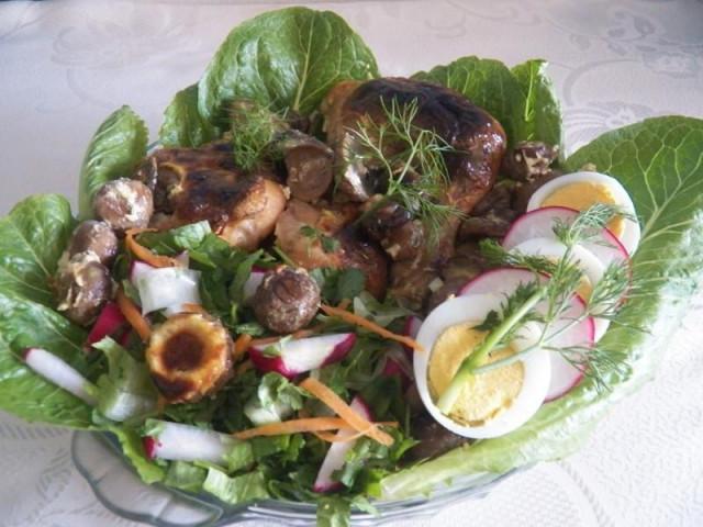 Достать курицу из духовки, уложить грибы поверх курицы.