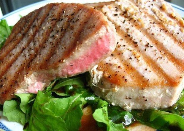 Теперь берём свежие или размороженные стейки тунца, опускаем их в маринад и отправляем на часок в холодильник, чтобы рыба как следует пропиталась. Теперь остаётся только достать рыбу из маринада и зажарить её на гриле. Тунец готовится быстро, достаточно будет обжаривать кусочки по 4 минуты на каждой стороне.