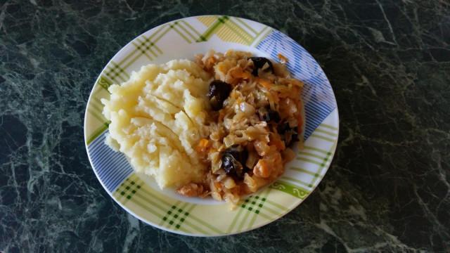 Тушеная капуста с куриным филе, томатной пастой, черносливом