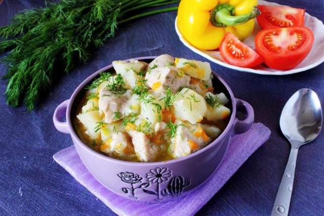 Ждем закипания воды, снимаем пену, убавляем огонь, накрываем кастрюлю крышкой и тушим блюдо 20-25 минут. Картошку я не перемешивала, чтобы она осталась целой. Окончательное время готовки зависит от сорта картофеля, но этого времени, думаю, в любом случае будет вполне достаточно.