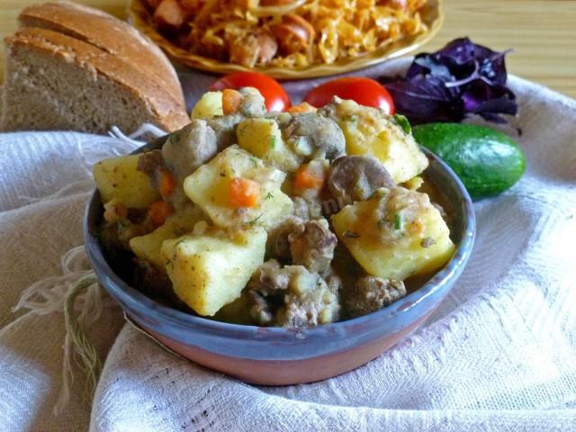 Тушеную картошку с печенью сразу же горячей подаем на стол.