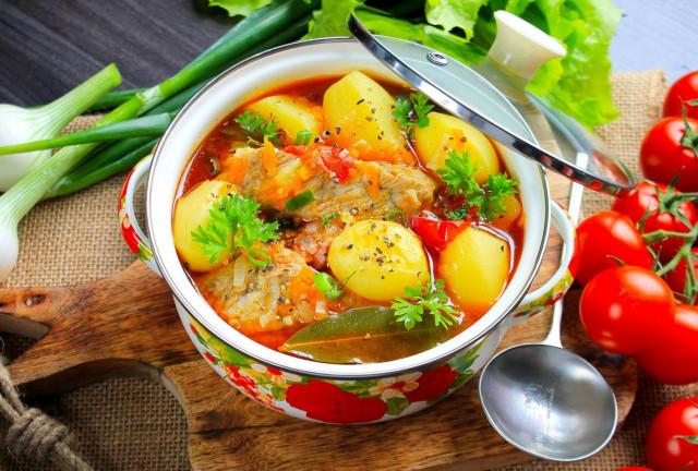 Как потушить картошку со свиными рёбрышками в кастрюле? Подготовьте все продукты по списку, указанные в рецепте. Очень вкусное блюдо получается, если использовать молодой картофель. Помидоры из рецепта можно исключить по вашему желанию.