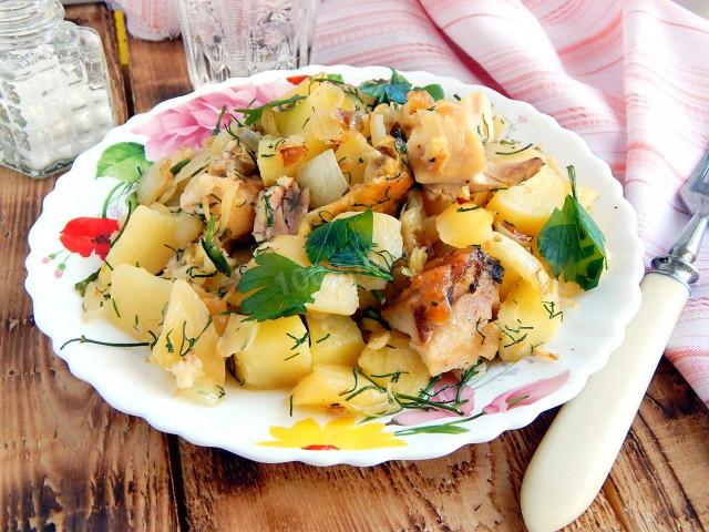 Посыпаем в конце тушения измельченной свежей зеленью укропа, перемешиваем, выключаем огонь. Кролик, тушенный с картофелем, готов. Можно подавать к столу.