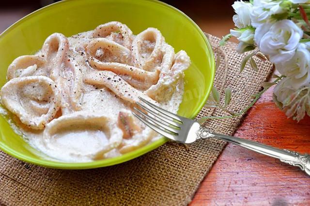 4. Добавляем к кальмарам сметану, перемешиваем, тушим не более 2-4 минут.
