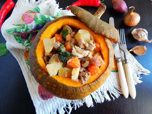 Красивое, вкусное и полезное блюдо из тыквы и свинины! Тыква, запеченная в духовке, это совсем не сложное в приготовлении блюдо, которое своим способом приготовления и подачей обязательно произведет впечатление на домочадцев и гостей. А запекание мяса в тыкве позволяет создать полноценное блюдо, мякоть тыквы можно использовать как гарнир к мясу. Но мясо в тыкве лучше запекать с другими овощами, чтобы блюдо получилось более сочным, ароматным и вкусным. Кроме того для хозяйки такой способ приготовления сокращает объем мытья посуды, поскольку мясо запекается в натуральном горшочке –тыкве, который также будет съеден.