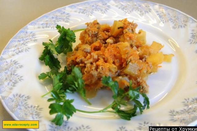 Возьмите свежую тыкву. Очистите ее от шкурки и выньте семечки. Потом порежьте ее на небольшие кубики. Положите их в кастрюльку и залейте горячим молоком. Пока тыква пропитывается, займемся другими овощами и фаршем. Почистите репчатый лук и морковь. Порежьте их на маленькие кубики. Возьмите сковороду и нагрейте на ней растительное масло. Сначала спассеруйте на нем лук, затем добавьте морковь. После помидоры, которые почистите от шкурки и порежьте на кусочки. В последнюю очередь к овощам добавьте мясной фарш. Все перемешайте и немного обжарьте. Через минут десять посолите и поперчите все по вкусу. Подавите чеснок. Вытащите тыкву из молока, обсушите и перемешайте с мясом. Переложите все на форму для выпекания. Накройте плотно фольгой и поставьте в духовку. Запекать нужно при температуре в 180 градусов около одного часа. За пять минут до конца снимите фольгу и поставьте тыкву с мясом опять в духовку. Должна получиться еда с золотистой корочкой. Приятного вам аппетита!