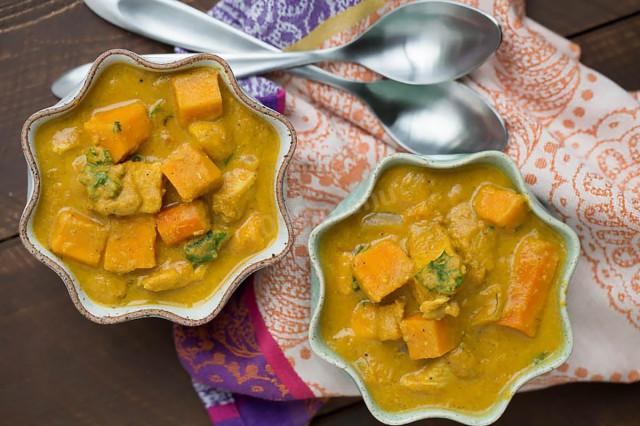 На разогретую сковороду налить немного растительного масла (половину) и выложить половину порции нарезанной кубиками тыквы. Обжарить тыкву до золотистой корочки и влить сметану и куриный бульон (можно заменить овощным). Перемешать тыкву и накрыть сковороду крышкой. На медленном огне тушить тыкву в течение 20-25 минут до мягкого состояния - чтобы ее можно было проткнуть вилкой. Добавить в сковороду порошок карри, порошок куркумы, соль, перец и тщательно все перемешать. Снова накрыть крышкой и тушить на протяжении 10 минут. Снять сковороду с огня и переложить все содержимое в чашу блендера (или кухонного комбайна). Взбить всё до однородного состояния на небольших оборотах. Это и будет соус, которым будет приправлено готовое блюдо.