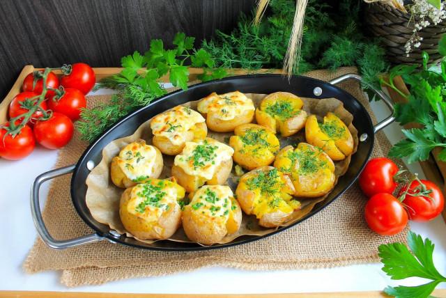 Поверх каждого клубня положите начинку. Какую начинку лучше сделать? Допустимо начинить на ваше усмотрение различными продуктами. На несколько картошин можно добавить по чайной ложке сливочного масла, чесночного соуса или тёртого сыра. Отправьте форму для запекания в заранее разогретую духовку и оставьте до того момента, когда картофель зарумянится. Температура и время зависят от возможностей вашей духовке. Я запекала при 220 градусах около 15-20 минут.
