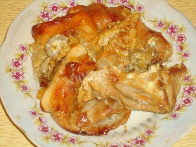 Затем куски зайца вынимаем из маринада, обсушиваем кухонным полотенцем и перекладываем на противень, солим и добавляем заранее нарезанные коренья и лук, поливаем маслом и жарим в предварительно разогретой духовке до образования красивой румяно-золотистой корочки. Во время жарки периодически поливаем куски зайца соком, который выделяется из мяса.