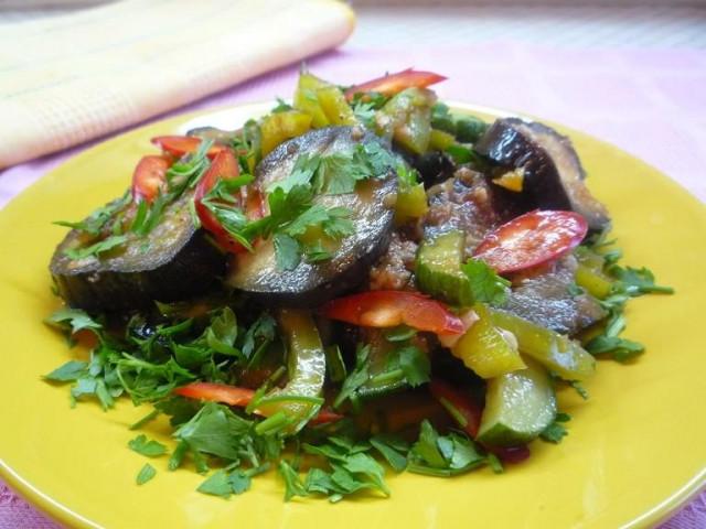 Все, закуска из баклажан готова, можно подавать к столу!!! Получается очень вкусно, остро-сладко. Количество острого перца и чеснока регулируйте в зависимости от величины и пристрастий, также сахар и уксус. Из зелени нужно использовать именно петрушку или кинзу. Огурец в рецепте указан как необязательный компонент, я в начале сомневалась нужен ли он, но мне очень понравилось его присутствие - он вносит свежесть.