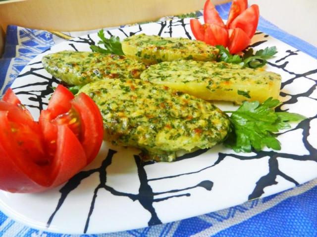 Любимая картошечка, запеченная с чесноком, зеленью и сыром! Пробуй! Очень вкусная, нежная, ароматная - что может быть вкуснее для воскресного обеда? Можно подавать как самостоятельное блюдо или как гарнир к мясу. Пальчики оближешь! Картошечка получается очень нарядная, можно ее и на праздничный стол поставить.
