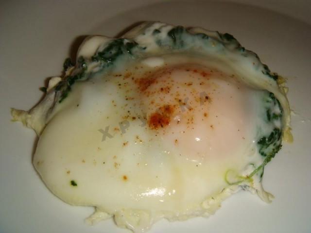 Раскладываем шпинат по 4-м смазанным маслом формочкам и ровняем его, делая в центре небольшое углубление. Оставляем немного остыть. Разбиваем в каждую лунку по яйцу