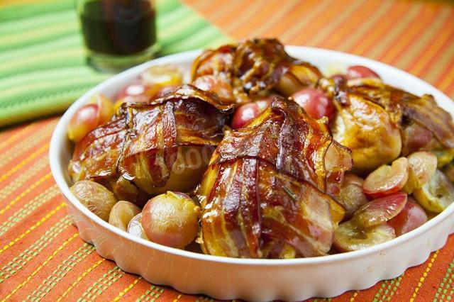 Но это еще не все. Остается еще один кулинарный штрих. Выкладываем на цыплят половинки виноградин, очищенные от косточек, поливаем все это снова соком и отправляем в духовку. Через восемь-десять минут блюдо готово.