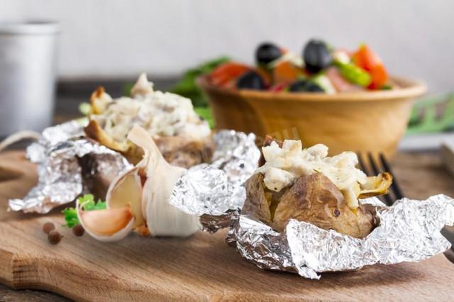 8. Картошку извлекаем из духовки, разворачиваем фольгу, делаем глубокий надрез сверху и наполняем картошку грибной начинкой. Сразу же подаем на стол!
