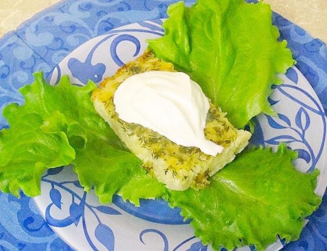 Сверху покрываем запеканку яично-сырно-укропной смесью. Отправляем в разогретую до 180-ти градусов духовку на 40 минут.