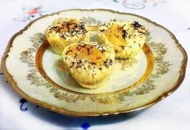 Выкладываем в формочки или в большую форму. У меня формочки силиконовые, смазывать не надо. Сверху в каждую формочку кладем дольку мандарина