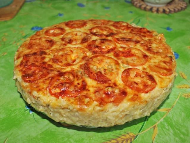 Выкладываем нарезанный дольками помидор по всей поверхности, затем выкладываем вторую половину сыра. Отправляем запекаться в заранее разогретую до 180 градусов духовку на 45 минут.
