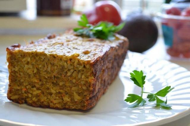 7. Выкладываем рисово-мясное тесто в форму и разравниваем. Накрываем форму фольгой и выпекаем в разогретой до 200 градусов духовке 45-60 минут.