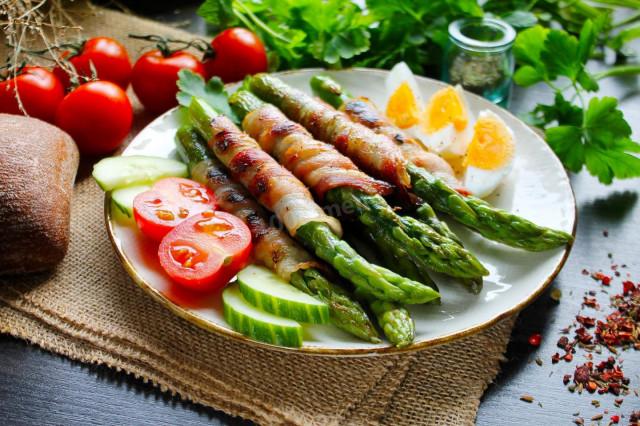Зелёная спаржа с беконом на сковороде