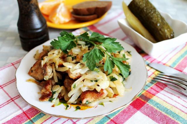Жареная капуста с мясом на сковороде - блюдо привычное и обычное, многие его готовят и любят. Для жарки приготовьте свиную мякоть - лучше с жирком (например, с шейной части или ребрышки с хрящиками), спелую белокочанную капусту (молодая будет готова намного раньше, учтите), репчатый лук для завершенности вкуса, соль и черный молотый перец, зелень петрушки.
