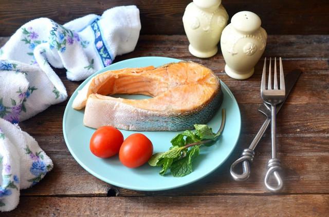 Подавайте жареную семгу со свежими сезонными овощами и ароматной зеленью. Приятного аппетита!
