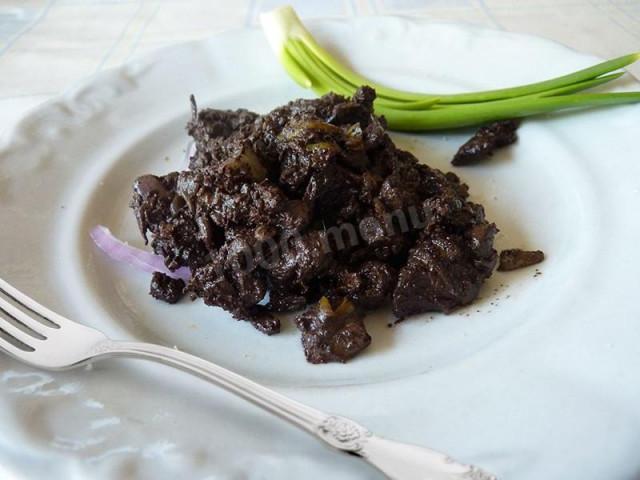 Интересное блюдо для гурманов! Простой способ приготовления! Жареная свиная кровь выступает в качестве второго горячего блюда, ее можно гарнировать отварным картофелем, рисом, овощами, а также подать самостоятельно с зеленью. Жаренную кровь можно дополнить своими любимыми пряностями и специями по вкусу.